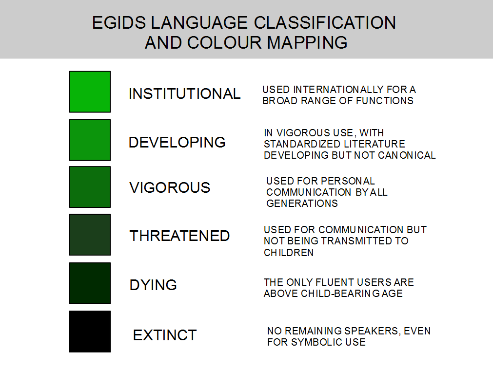 This visualization shows the breakdown of language health within this country. The full length of the bar represents the total number of languages spoken, broken down by colour to reflect what percentage of the languages are ranked at each EGIDS level. Mouse over each section to see more detailed information.