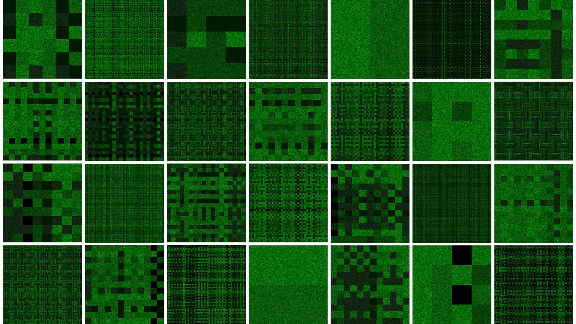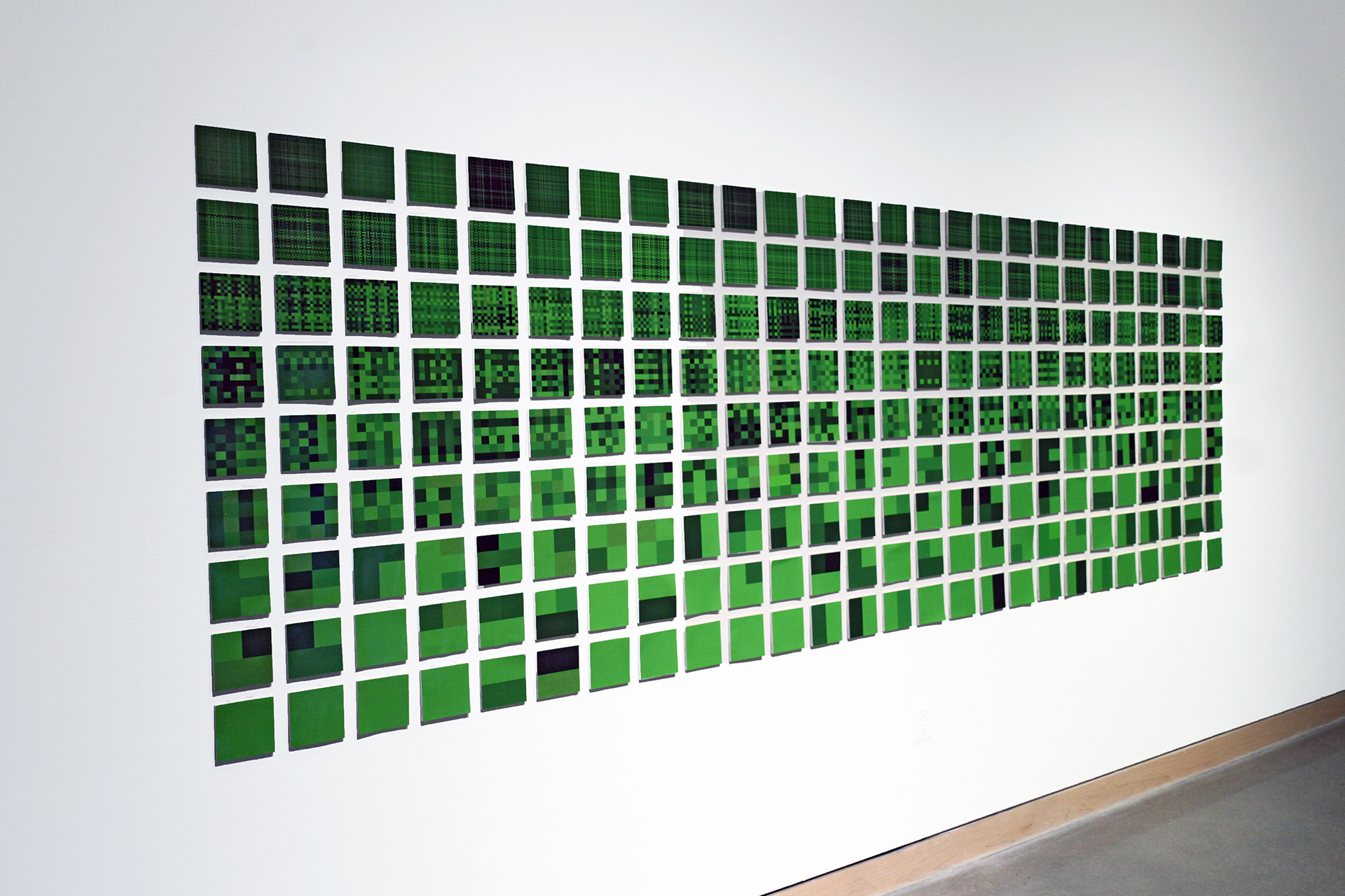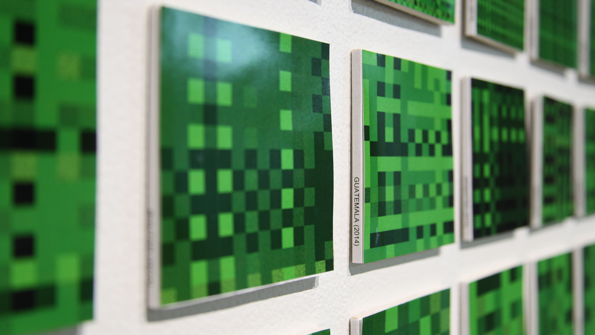 Each of these images, conceptualized as a small swatch of woven cloth, represents the language profile for an individual country. Every one of the threads composing this metaphorical weaving stands in for a language, its color corresponding to the health of that language on a six-point scale of black (extinct) through bright green (what is coined “institutional”). Since each swatch is kept the same size, the individual threads will be smaller in countries where many languages are spoken, and much larger in countries with less language diversity. The combined effect of colour tone and weaving density offers a snapshot view of the language landscape of a country.